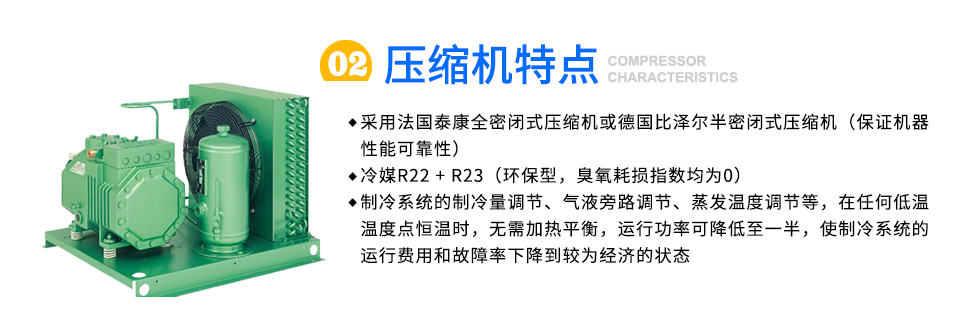 壓縮機(jī): 1,采用法國(guó)泰康全密閉式壓縮機(jī)或德國(guó)比澤爾半密閉式壓縮機(jī)(保證機(jī)器性能可靠性) 2,冷媒R22 + R23(環(huán)保型,臭氧耗損指數(shù)均為0) 3,制冷系統(tǒng)的制冷量調(diào)節(jié)、氣液旁路...